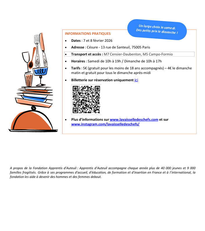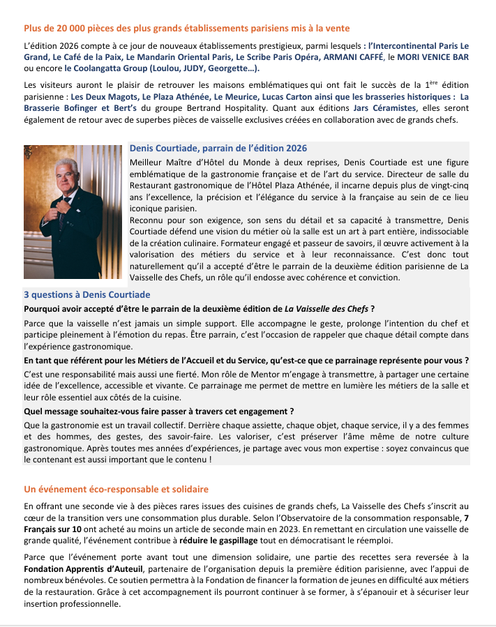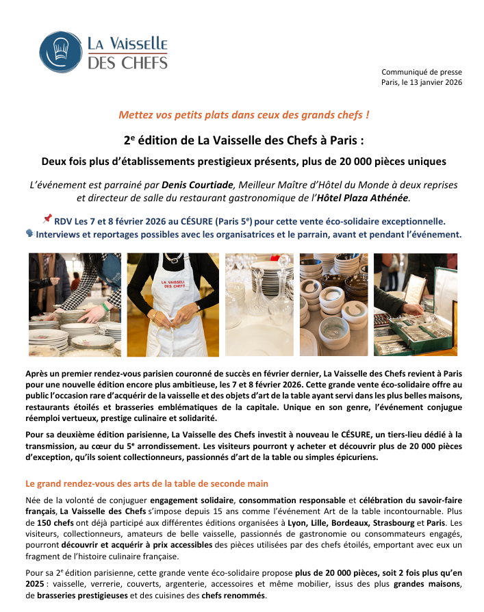 Après une première édition parisienne couronnée de succès, La Vaisselle des Chefs revient en 2026 avec une édition encore plus ambitieuse. Cette grande vente éco-solidaire offre au public l’occasion rare d’acquérir de la vaisselle, de la verrerie, des couverts, de l’argenterie, des accessoires ou encore du mobilier ayant servi dans les plus belles maisons, restaurants étoilés et brasseries emblématiques de la capitale.